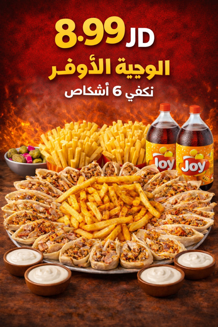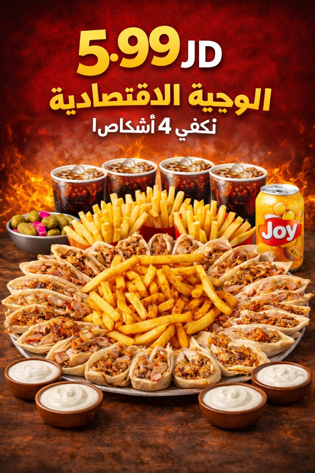 - وجبة الشاورما الاقتصادية بتكفي 4 أشخاص وفيها: - 6 سندويشات شاورما دجاج بخبز الشراك - 1 لتر مشروب غازي - 1 بطاطا كبير - مثومة ومخللات وكل هاد بس بـ 5.99 دنانير!