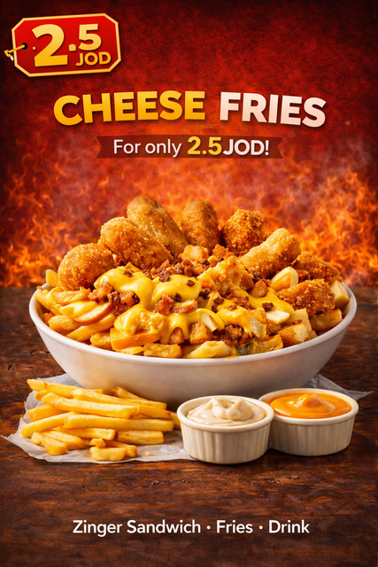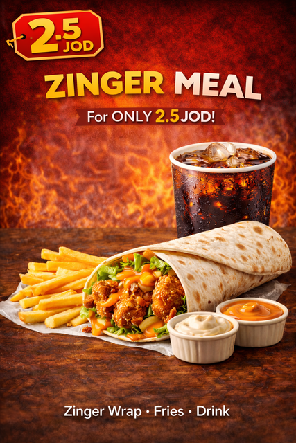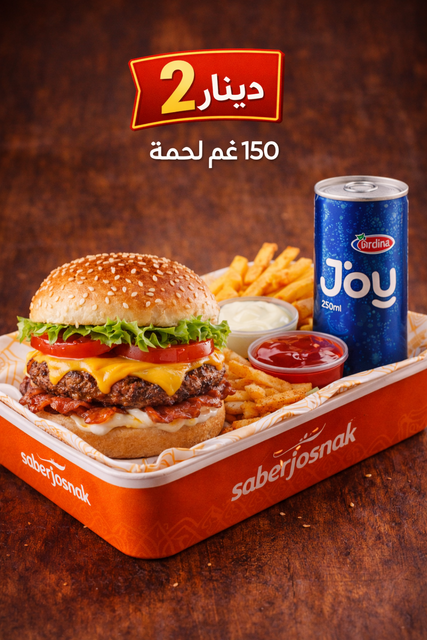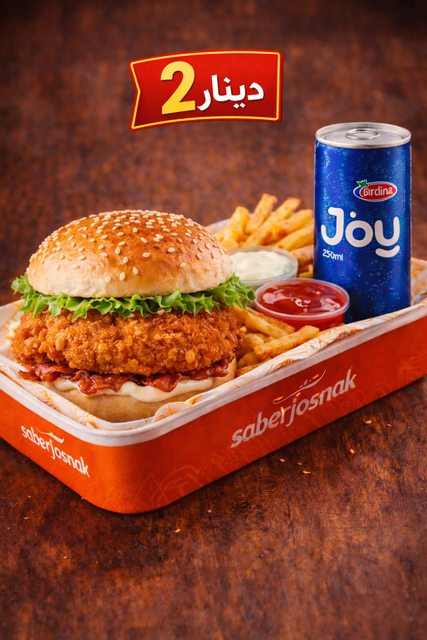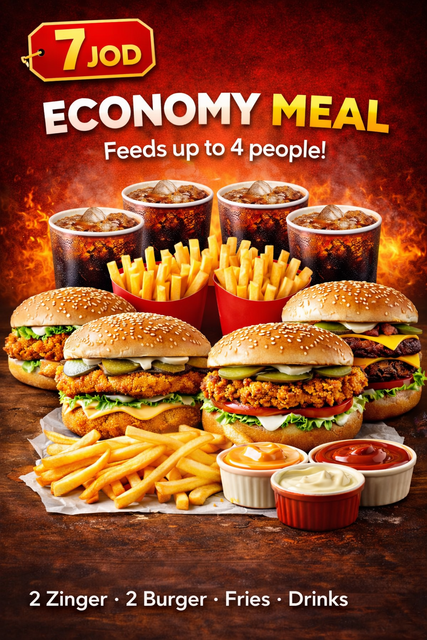 🔹 الوجبة الاقتصادية – 7 دنانير بتكفي 4 أشخاص 4 سندويشات (2 سكالوب 1 برجر 1 زنجر بطاطا بيبسي كبير صوصات