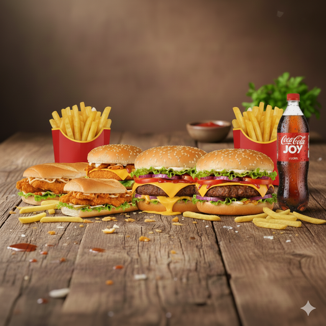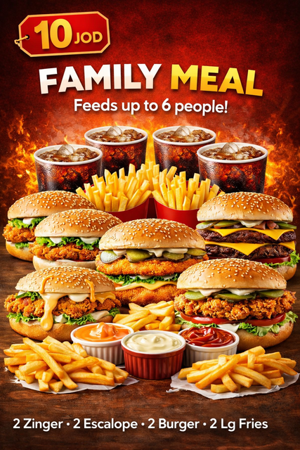 🔹 الوجبة العائلية – 10 دنانير بتكفي لغاية 6 أشخاص 2 زنجر 2 اسكالوب 2 برجر لحمة 2 بطاطا كبيرة مشروبات صوصات
