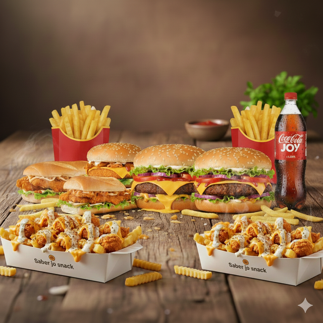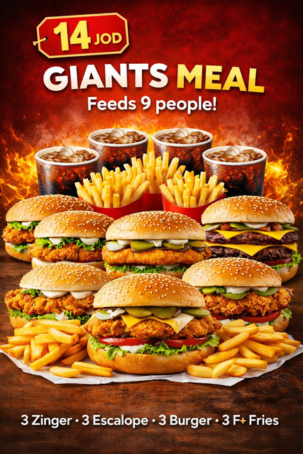 🔹 وجبة العمالقة – 14 دينار بتكفي 9 أشخاص 3 زنجر 3 اسكالوب 3 برجر 3 بطاطا مشروبات صوصات متنوعة
